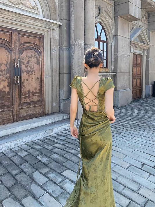 This is an emerald satin dress with a green lace design, with the main highlight...