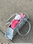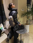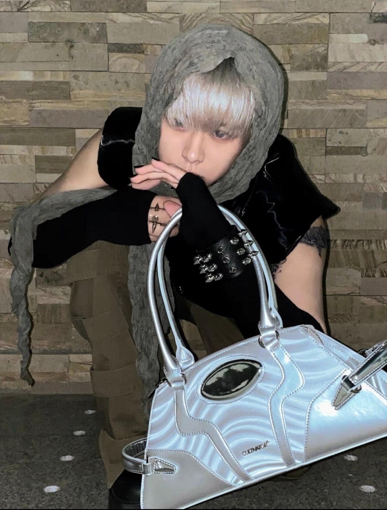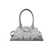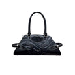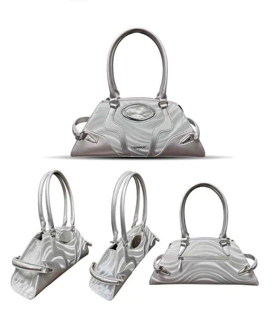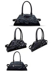This bag features intricate craftsmanship, utilizing silver or black leather to create a heavy metal aesthetic. It boasts a large capacity and includes numerous detailed design elements.