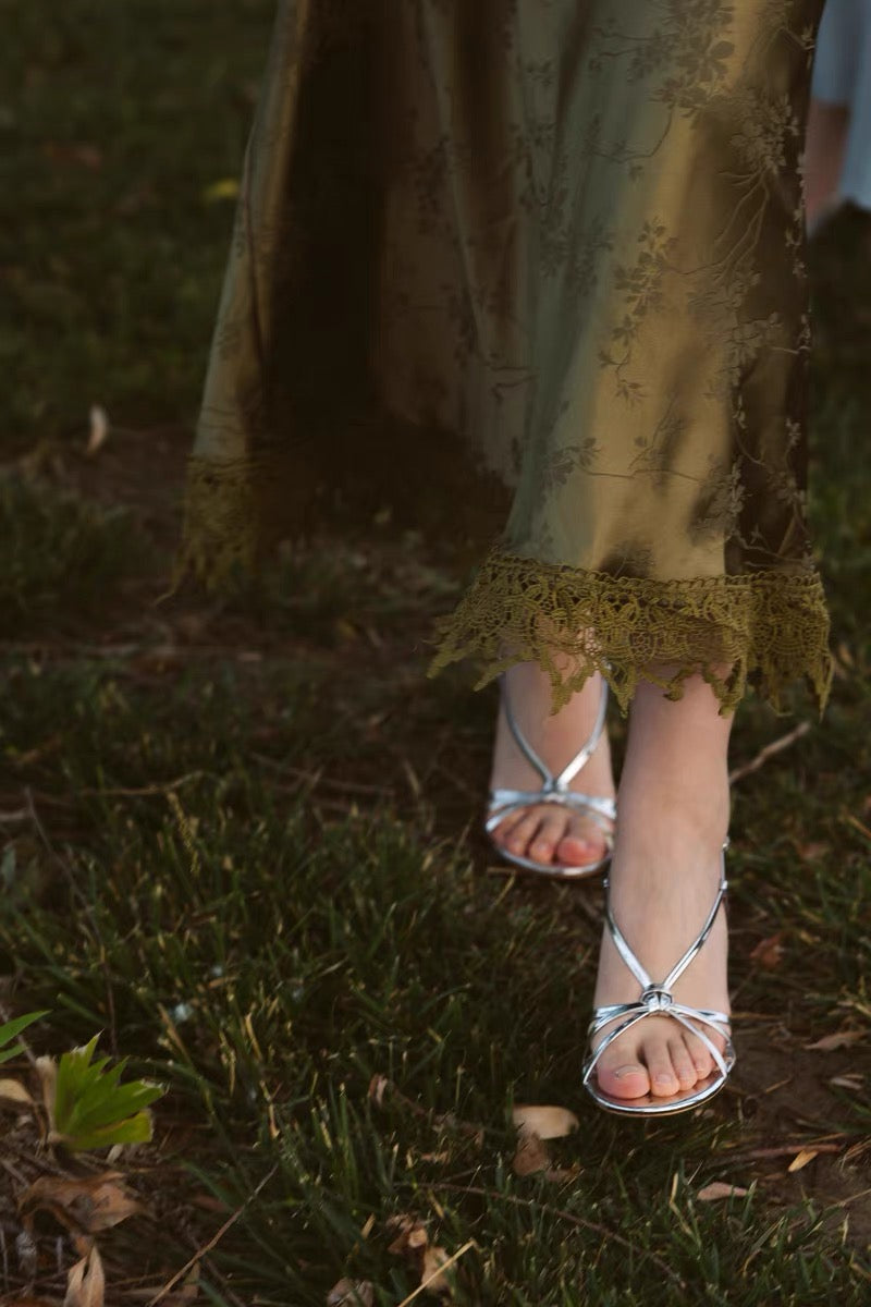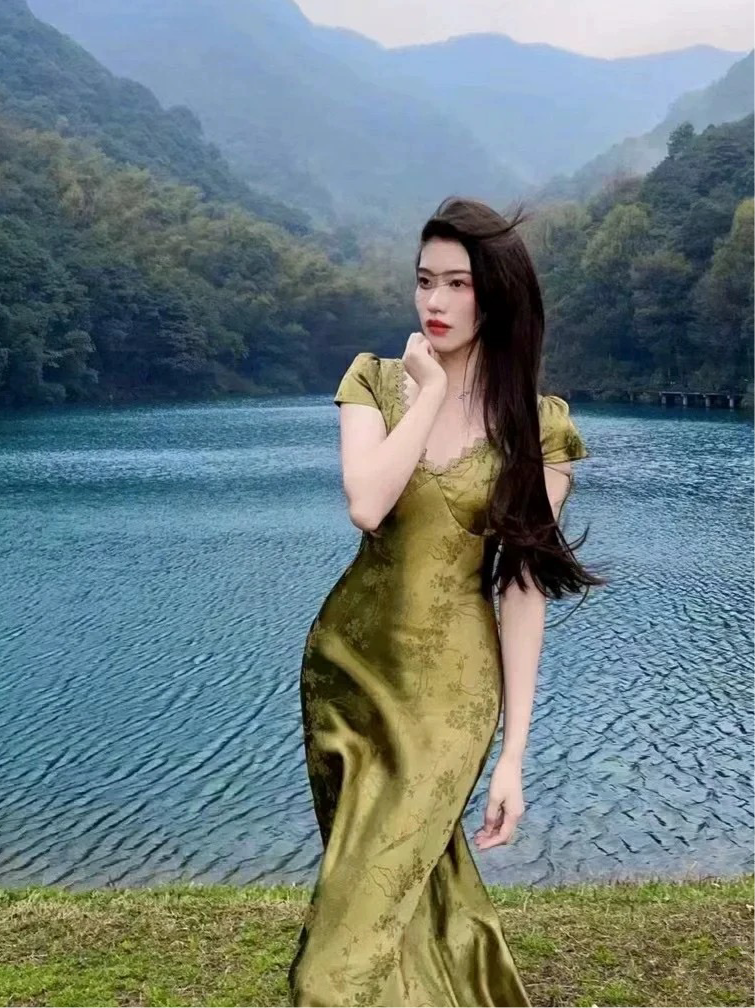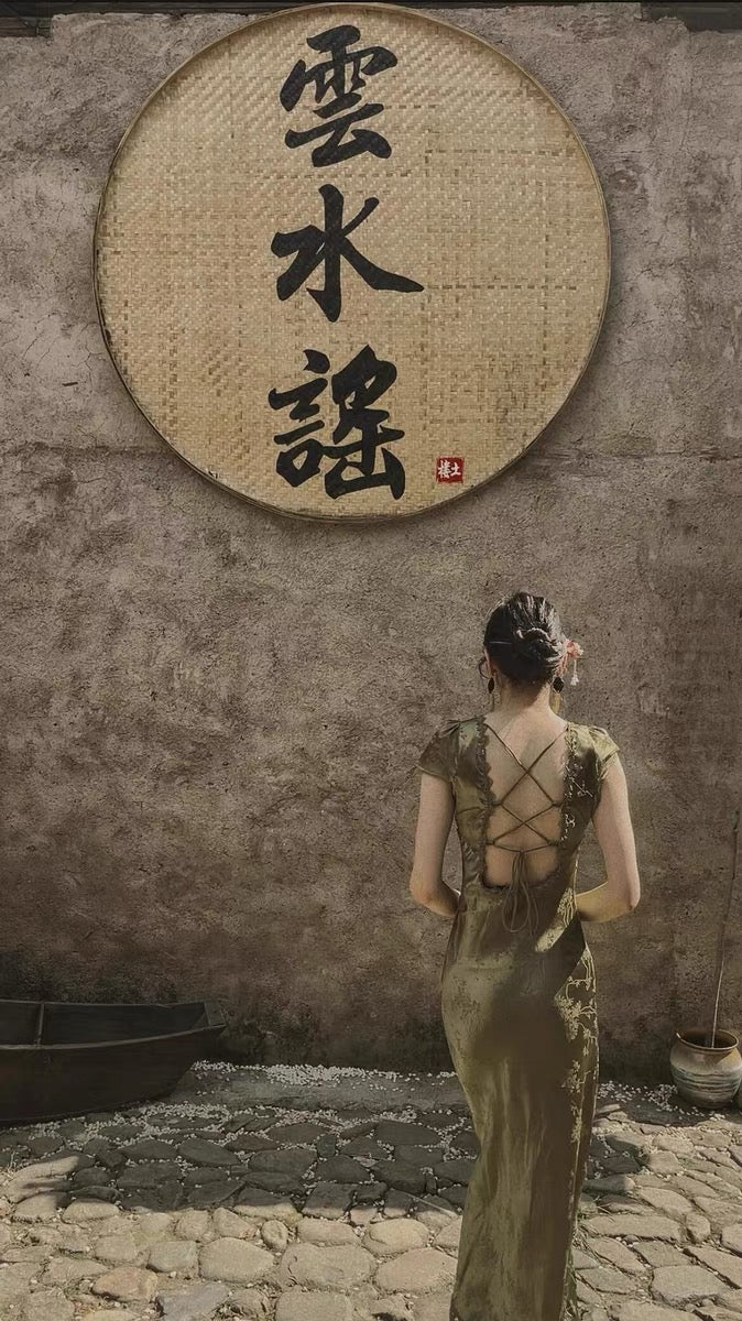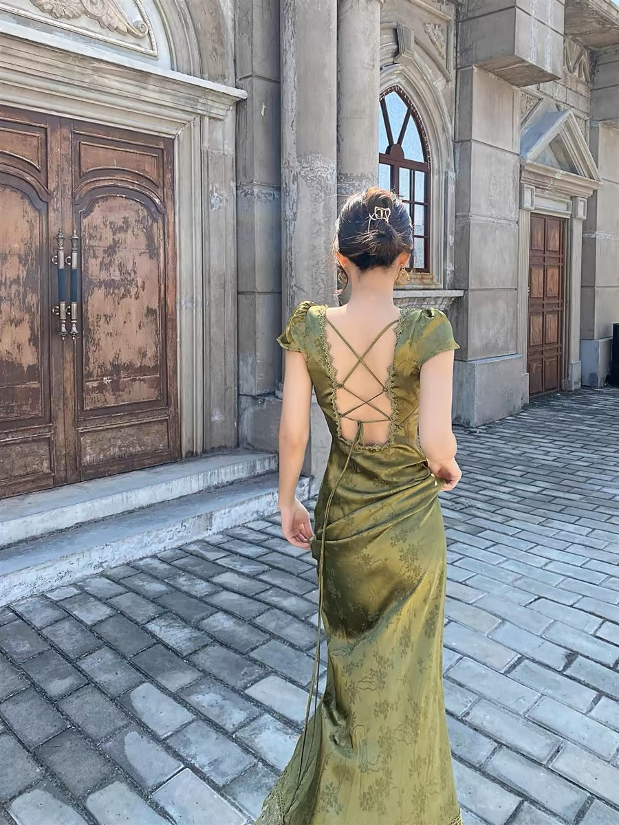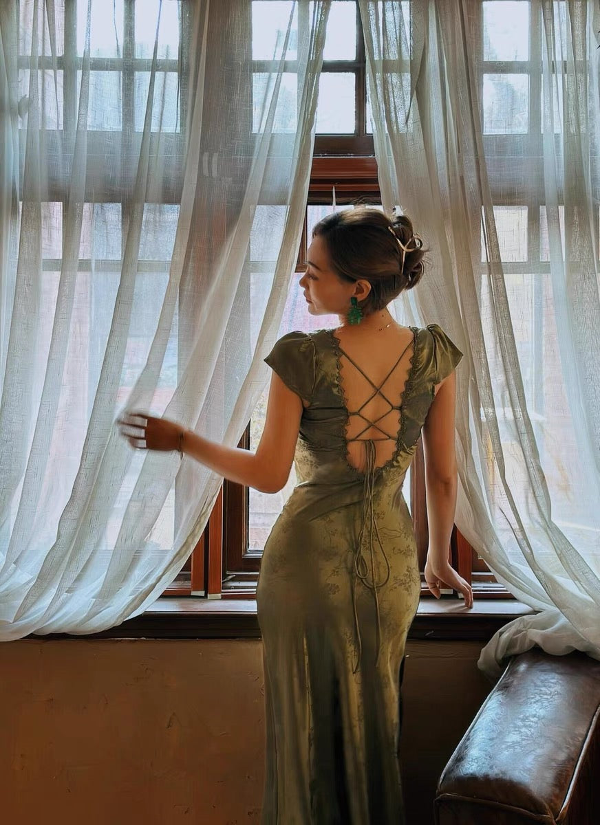 This is an emerald satin dress with a green lace design, with the main highlight in the back.