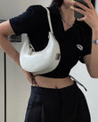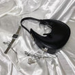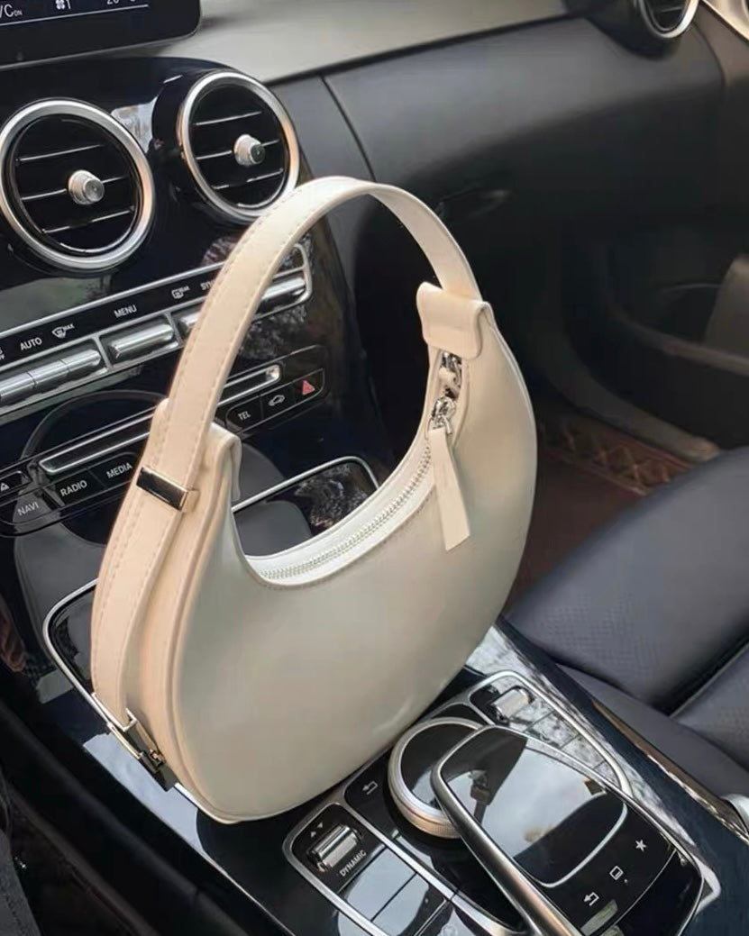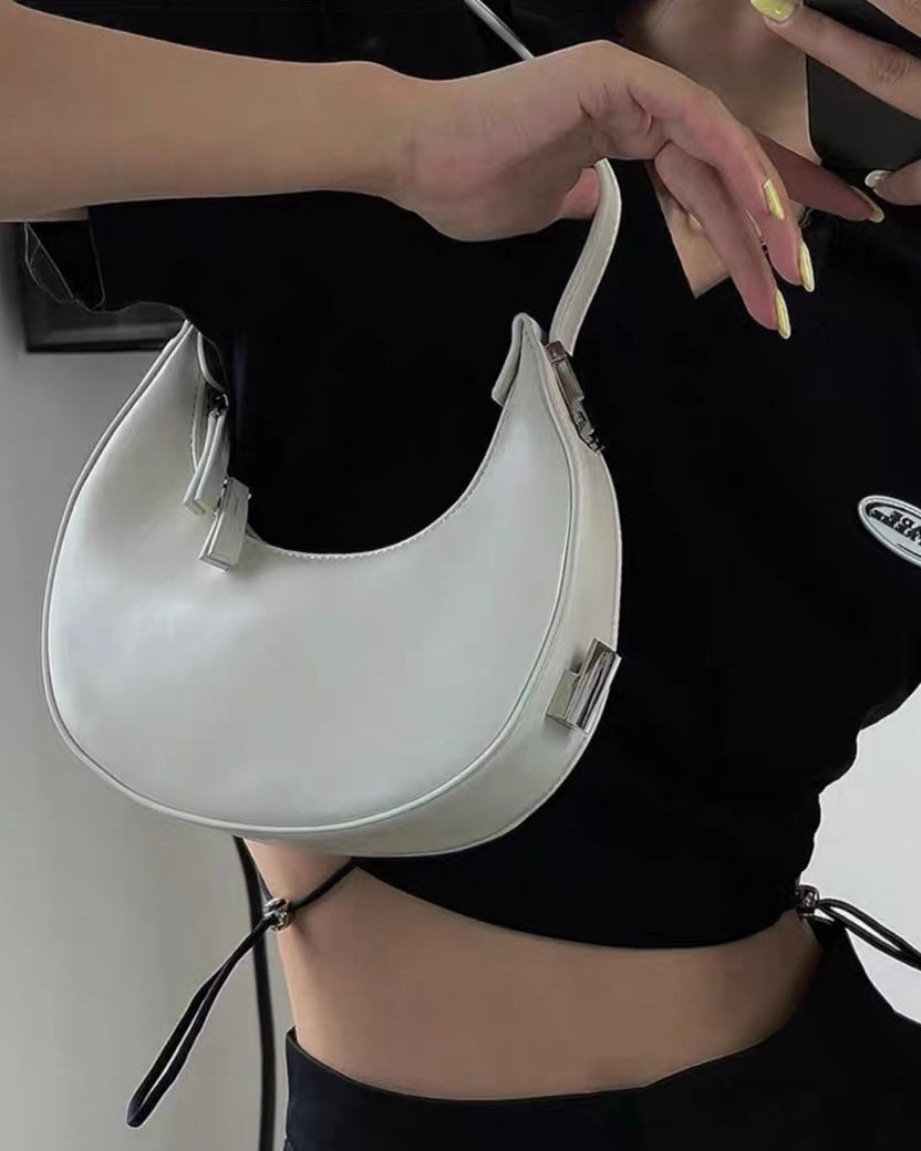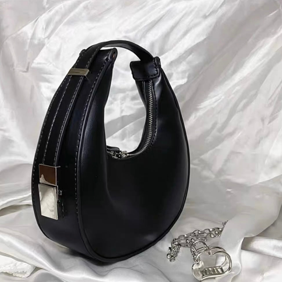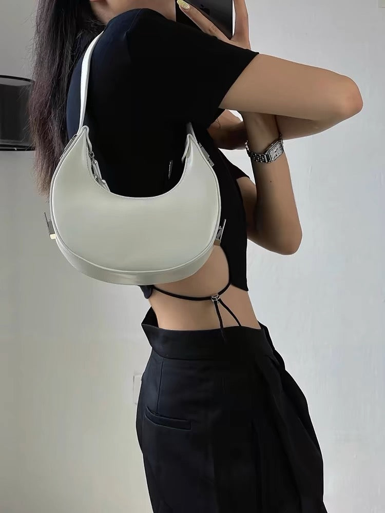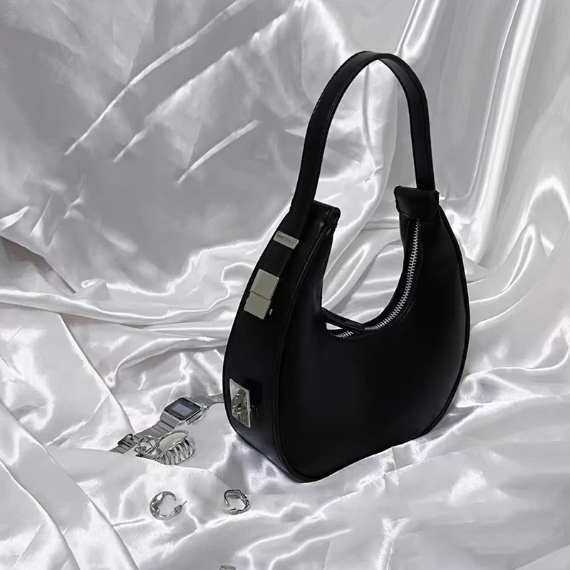 This bag features metal accents paired with a curved dumpling-shaped design, giving it a cool yet gentle vibe. It’s a versatile piece that goes well with any outfit. Despite its small size, the curved design allows it to hold a surprising amount, making it very practical.